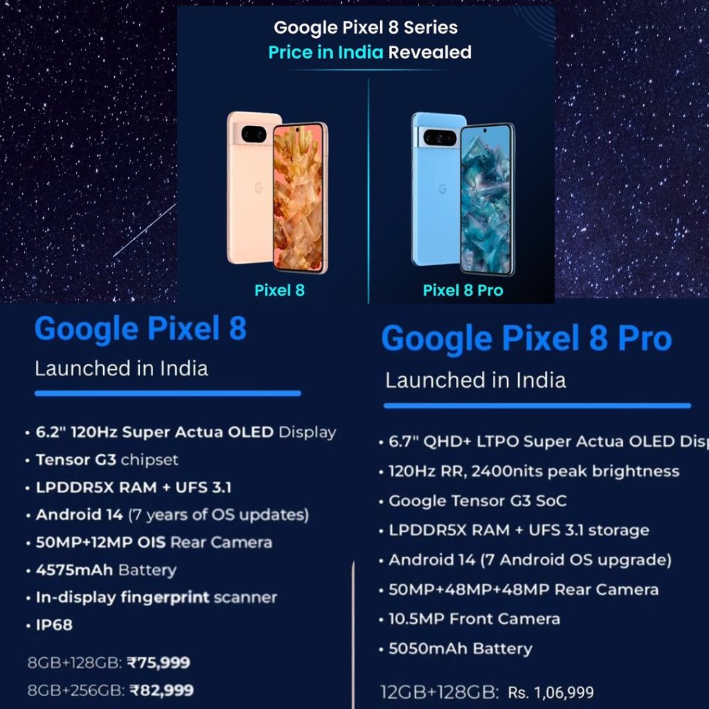 गूगल की नई स्मार्टफोन सीरीज गूगल पिक्सल 8 को भारत में आज लॉन्च कर दिया गया है। इस सीरीज के तहत दो स्मार्टफोन गूगल पिक्सल 8 और गूगल पिक्सल 8 प्रो को लांच किया गया है। गूगल पिक्सल 8 के 128 जीबी स्टोरेज वेरिएंट की कीमत 75,999 है। गूगल पिक्सल 8 प्रो की कीमत 1,06,999 रुपए है। यह फोन की 128 जीबी स्टोरेज की कीमत है।